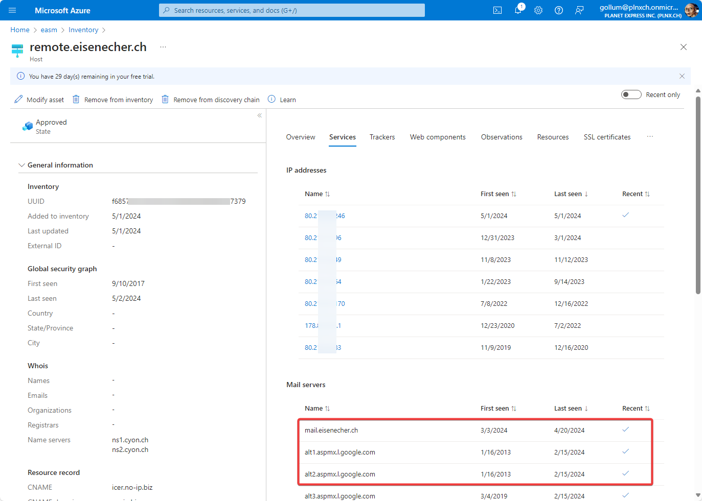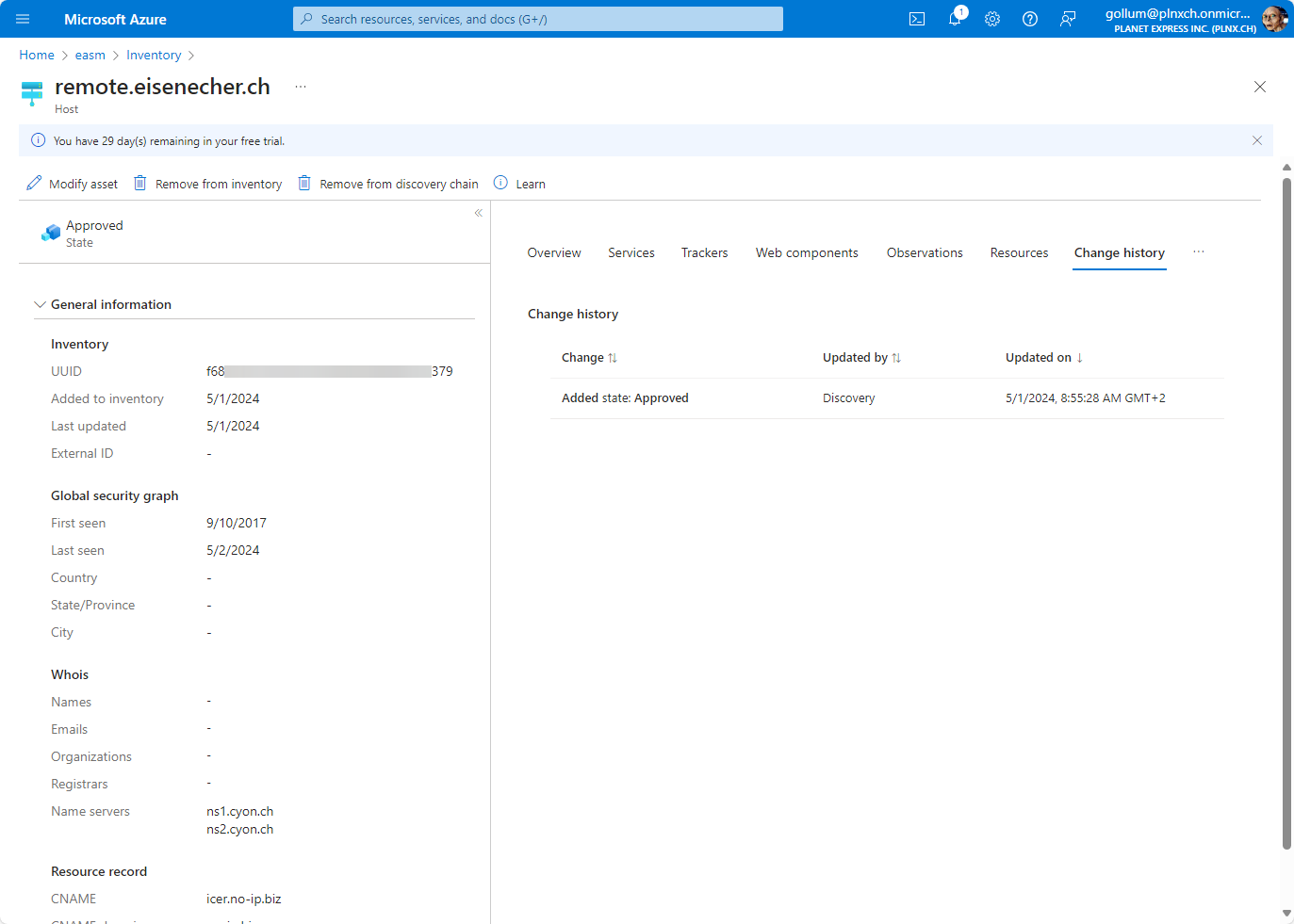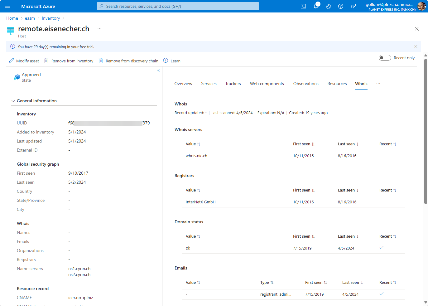 ) we initially specified in the discovery page, EASM found additional hosts which belong to your assets. Beside of the name you get additional information like IP address, corresponding DNS servers, when the name was first and last seen. If you click now on the host you get details about the host. Here are screenshots of the details EASM discovered:
